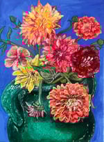 This piece is a still life painting — imagined using dahlias that were hand plucked from a PYO flower farm in the late summer of '25 , placed in one of my favourite ceramic vintage vases. This painting is very special to me, as it brought me out of a two year painting rut — that i entered after finishing my fine art uni course.