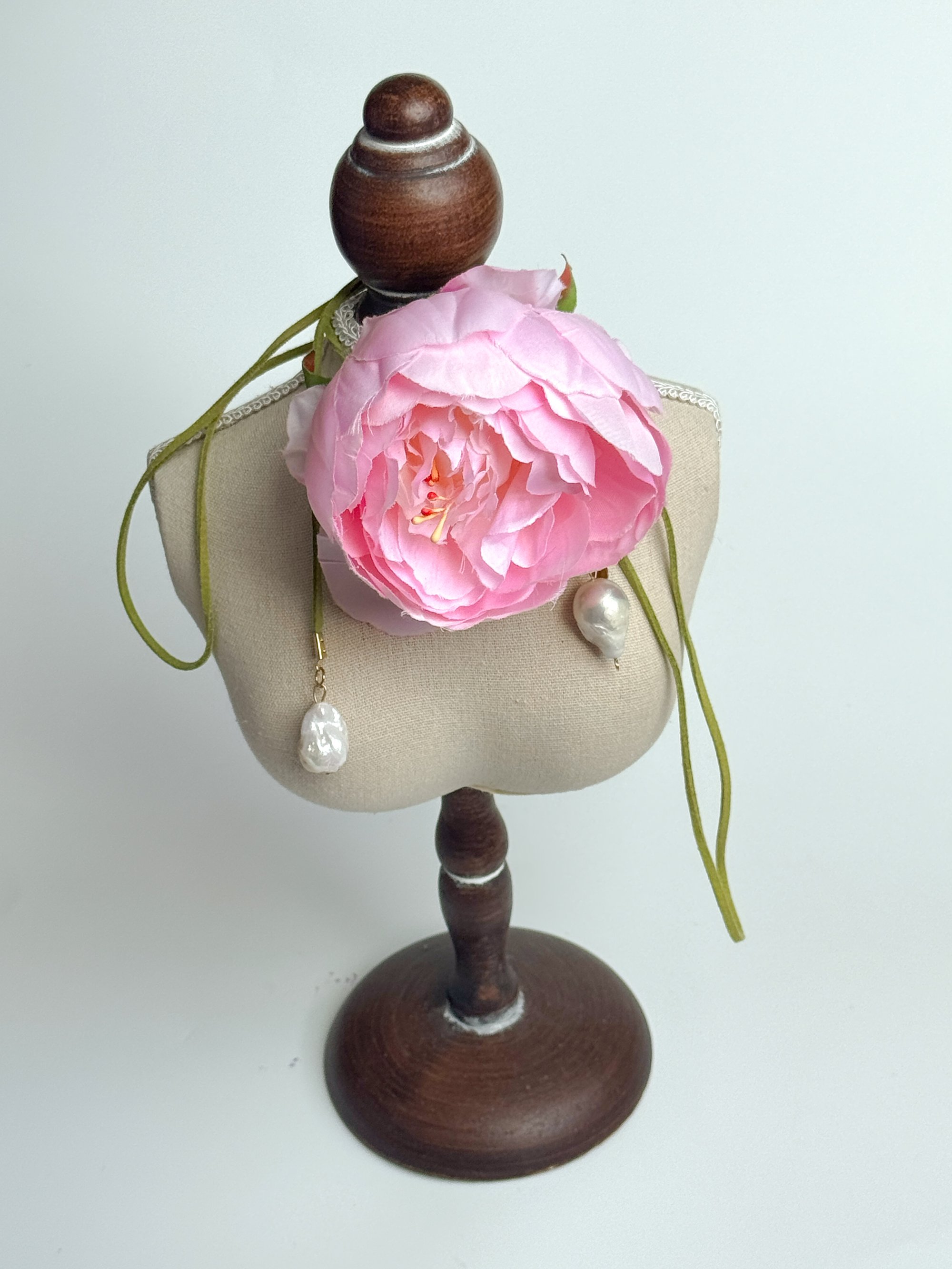 Hand crafted silk peony choker. strung upon a faux suede string with natural baroque pearls & 18k gold plated stainless steel detailing.