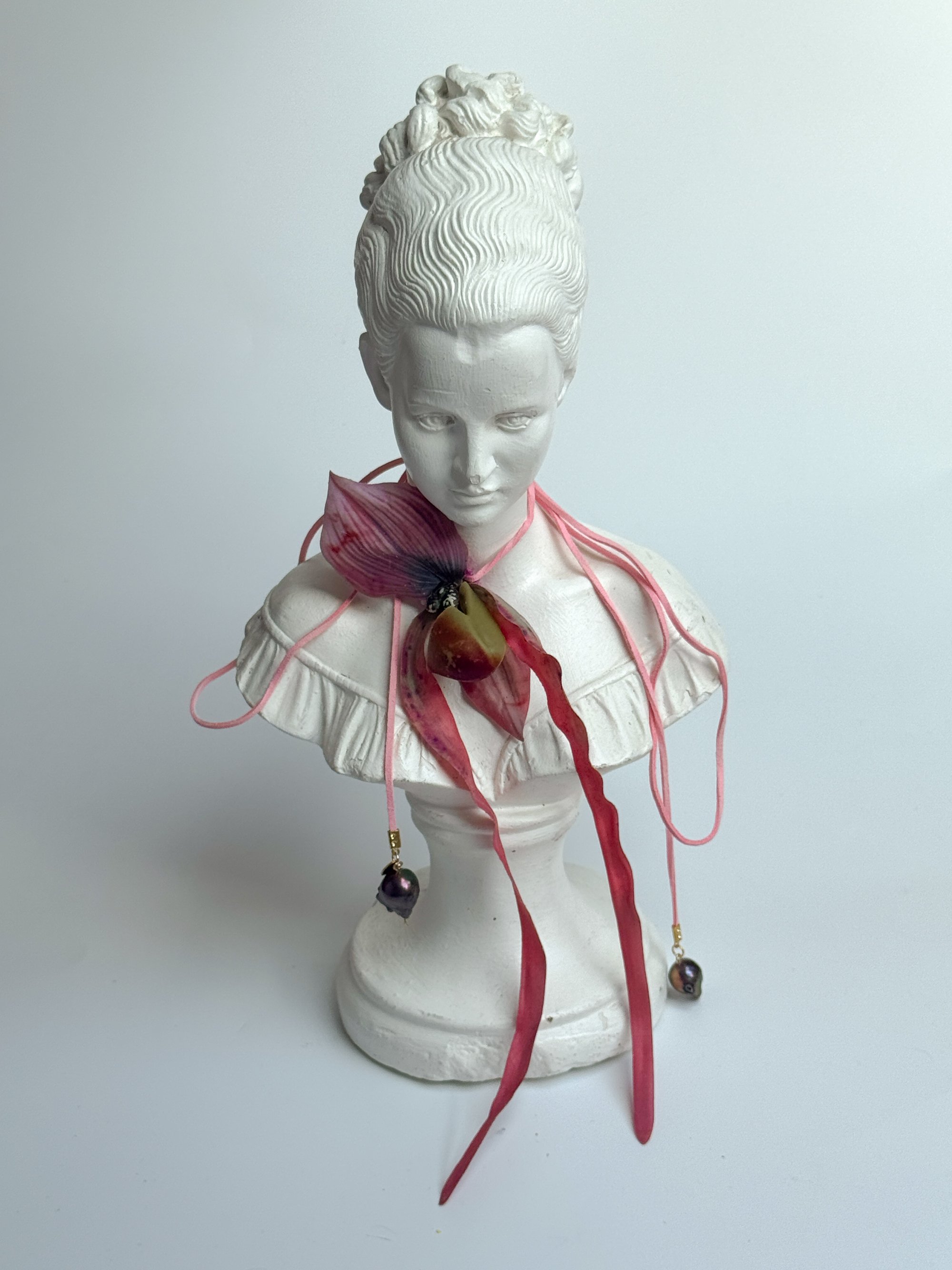 Hand crafted string pearl orchid choker. strung upon a faux suede string with natural baroque pearls & 18k gold plated stainless steel detailing.
